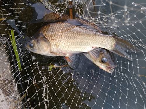 バレた…。針を見てみると折られていました。やはり貧弱過ぎましたか。雑魚目当てに来ているのに尺超えのフナが奇襲。