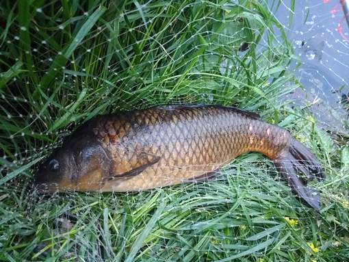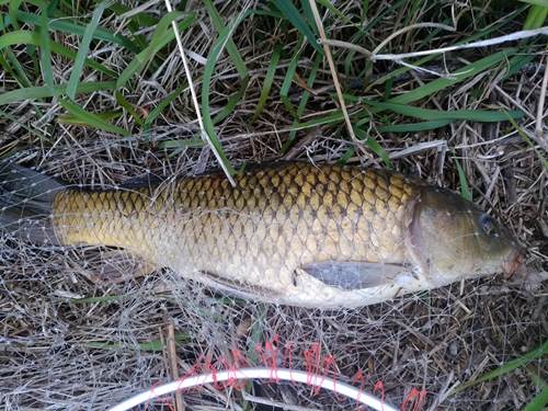 立ち上がって一緒に岸沿いに走りました。しばらく鯉の力強い抵抗に耐えました。足元に寄らせるまで時間がかかりました^^;