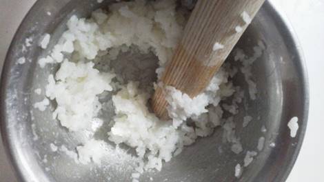 糠御飯の威力をもう一度確認したく、3日前くらいの白米を温め、すりこぎ棒でゴシゴシと潰しました。