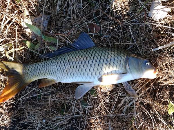 鮒でもなく鯉でもない。体が細長く30~40cmほどの魚体が水中で白い脇腹をちらつかせながら泳いでいました。