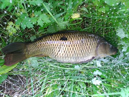 動きは遅いけれど重い鯉でした。そこそこあがいてネットイン。