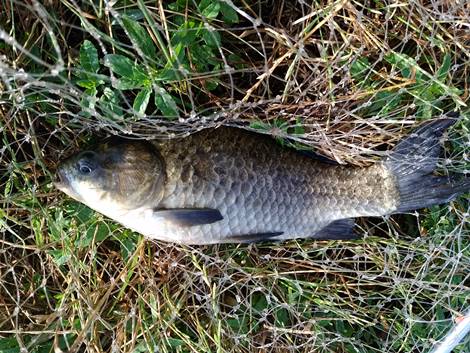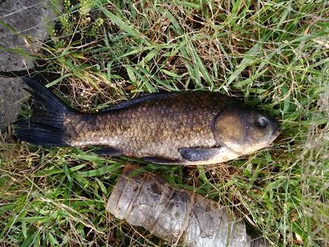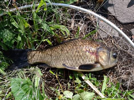 片目の鮒でした。先天性ではないと思います。多分川鵜でしょうね。川鵜の猛攻激しく、尺鮒でも丸呑みしようとしてきます。呑み込めないことが多々あるようで傷だらけの鮒が非常に多いです。